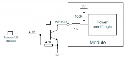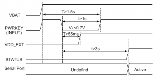 Fig. 4 shows the time diagram for switching on the GSM module and, more precisely, shows the trend that the PWRKEY signal on the transistor collector must have. Therefore, in order for the GSM ignition operation to be successful, it is necessary that, after having given power, you wait at least 500ms before sending the ignition pulse (which must last more than 1 second).
