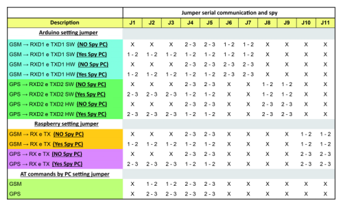 So, if you want to spy on AT commands, and their answers, sent to GSM module jumpers J1, J2, J3, J4 and J5 must be in position 1-2. If you want to spy on the data received from the GPS modules, jumpers J1, J2 and J3 must be in position 2-3 while jumpers J4 and J5 must be in position 1-2. If you want to send AT commands directly from a PC, for example, to study new commands to be implemented in Arduino or Raspberry Pi sketches, you must configure the jumpers as follows: jumpers J2 and J3 in position 1-2, jumpers J4 and J5 in position 2-3 and jumpers J1 indifferent (configuration for sending AT commands to GSM section). Or jumper J2, J3, J4 and J5 in position 2-3 and J1 indifferent (configuration for reading GPS data).