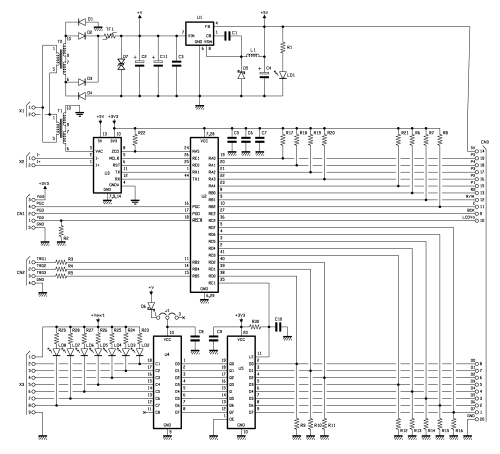 Finally, there is the power source section, that is composed of a line transformer, and a switching voltage regulator for the generation of +5Vcc needed by the board.