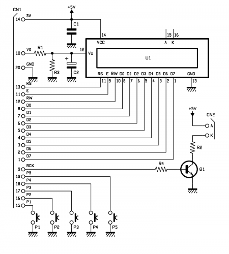 Some pull-up resistors have also been added for the E, R/W and RS lines, as well as for the lines of the buttons from P1 to P5.