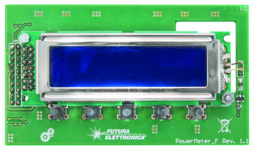 The front board, whose circuit diagram may be seen in these pages, includes the LCD screen of the 162D series by Displaytech, the five buttons and some other side components.