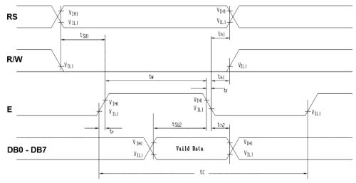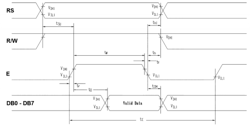The communication interface of the LCD screen includes the 8-bit data bus, in addition to the three control lines, as already mentioned. Fig. 6 shows the line temporizations for a writing session. As a first thing, the piece of data on the 8 bit bus is set, and still keeping in mind that there must not be active enable lines, otherwise the piece of data may be acquired even by another integrated circuit that is not interested in it; at a later time the RS and R/W lines are moved, so to inform whether a piece of data (RS at a high logic level) or a command (RS at a low logic level) is being sent.