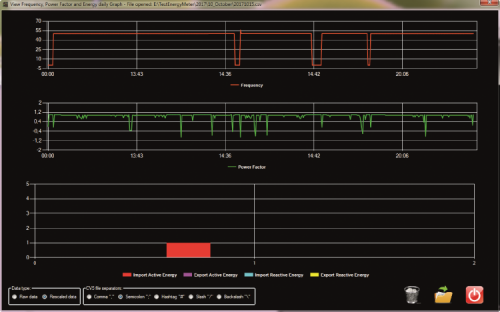 5) the icon signed with the number “5” is needed in order to recall and display all the data that has been memorized in the CSV files that we previously saved, in a graphical way. In this case, the measures as for frequency, power factor and imported/exported energy will be shown;