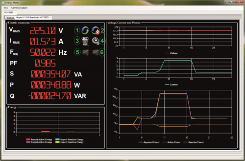 1) the icon signed with the number “1” is needed in order to start the reading of the registers containing the electrical measures, the reading frequency occurs once per second. Before starting to read the registers containing the electrical measures, the communication between the PC and the MCP39F511 integrated circuit must be enabled, as previously described;