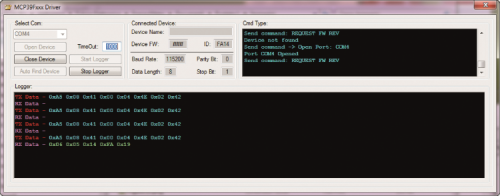 If you know the serial port to be used, you may manually select it from the drop-down menu and then click on the “Open Device” command. On the other hand, if you do not know the serial port to which the board is connected, it is possible to click on the “Auto Find Device” command; in this way an automatic search will start, and in the case the device we were looking for is found, it will be automatically connected, and will occupy the corresponding serial port. Once the device has been found, a series of information will appear in the “Connected Device” section. On the side, in the “Cmd Type” section, a list of the commands sent is created. If we wanted to see the data packets that have been sent and received, it is possible to activate the “Logger”, by clicking on the “Start Logger” command. In order to end the communication and to free the serial port, we have to click on the “Close Device” command.