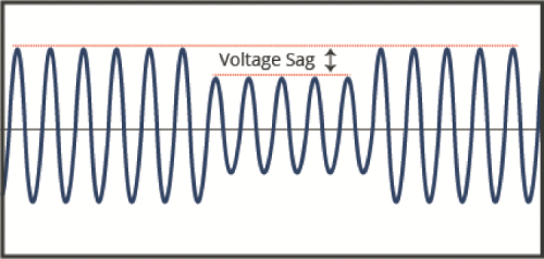 The last three events are a matter of routine, while the first two require some additional explanations since the integrated circuit manages them in a way that is very different from the last three. The “Voltage Sag” term indicates a sudden decrease in the RMS voltage in an extremely short lapse of time. This phenomenon may be due to a short circuit on the line, or to an overload or to an electric engine starting. The RMS voltage could decrease for a value between the 10% and the 90% of the nominal voltage, as shown in Fig. 5. Moreover, it is possible to identify three kinds of SAGs: the instantaneous one, the momentary one, and the temporary one. The first one lasts from half a sinusoid cycle to a maximum of 30 cycles, the second one lasts from a minimum of 30 cycles to a maximum of 3 seconds and the last one from a minimum of 3 seconds to a maximum of 1 minute. Differently, from the previous one, the “Voltage surge Limit” term indicates a sudden increase in RMS voltage in an extremely short lapse of time, as shown in Fig. 6. The duration of these pulses remains at about a maximum of 50 µs, as concerns the overvoltages, and at 20µs as for the overcurrents.