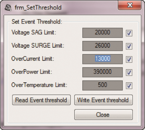 Let’s see now how to set and program the thresholds as for the above-described events. First of all, you will have to recall the specific configuration window, by clicking on the “Set Event Threshold” command; Fig. 7 shows the configuration window. It may be noticed that, for each text box in which to specify the threshold value, there is a corresponding tick box in order to select which values have to be sent to the integrated circuit, and which ones should not. Once the thresholds of interest have been configured and selected, you will have to click on the “Write Event Threshold” command, in order to send the data to the integrated circuit, with the memorization on the Flash memory following. If on the other hand, you wish to see how the registers have been configured, you will have to click on the “Read Event Threshold” command; in this way, the memorized information concerning the integrated circuit will be shown. Please notice that the threshold value to be specified must have the same resolution set as for the electrical measurings. In other words, if you have set two decimals as for the voltage measuring, then the voltage threshold value must have two decimals; the same goes for the other measurings. The only threshold that does not follow this rule is the “Over Temperature Limit” one, that accepts values ranging from 0 to 1023.