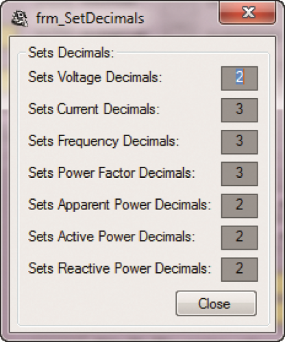 Please remember to use the same amount of decimals for the measures of the three power quantities. Fig. 4 shows the configuration window as for the decimals; we advise you not to modify these values since they have already been optimized for our application. In the case in which you wanted to configure the integrated circuit for another application, one that is different from ours, and therefore with a modified hardware, it will be up to the user to select how many decimals to use for his own electrical measures.
