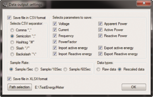 Finally, if you have to select in which directory to save the electrical measures that have been acquired, in order to do so you will have to click on “Path Selection” and then to select the path in which to save the files containing the measures. Once the path has been selected, the software will divide – in a totally automatic way – the electrical measures by day, month and year. In other words, the directory for the current year will be created, if not found; under the directory for the current year, twelve folders will be created (one per each month of the year), and finally in each folder for the current month, the data acquired by the integrated circuit will be saved, daily. The names assigned to the files will be thus composed: “YYYYMMDD” in which “YYYY” identifies the current year, “MM” identifies the current month and “DD” identifies the current day. Once all the parameters have been configured, please click on “OK” in order to save the configuration. The saved configuration will be retrieved and used at each time the software is started.