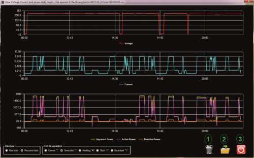 Fig. 10 shows the content of the CSV file displayed, as regards the voltage, current and power measures. In order to properly open the files, a pair of selections must be carried out, as regards how the electrical measures have to be saved in the file, and as for the separator that has been used. As it has been said different times already, the software uses the “;” separator as per default settings. However, the user may select other separators, depending on the one that is used, in order to generate the CSV files he wishes to open. In addition to the separator, the user must select whether the data contained in the file has to be already rescaled during the writing stage, or if the file contains the RAW files, that is to say, in the way they were read by the integrated circuit, without any kind of processing. On the right there are three icons: