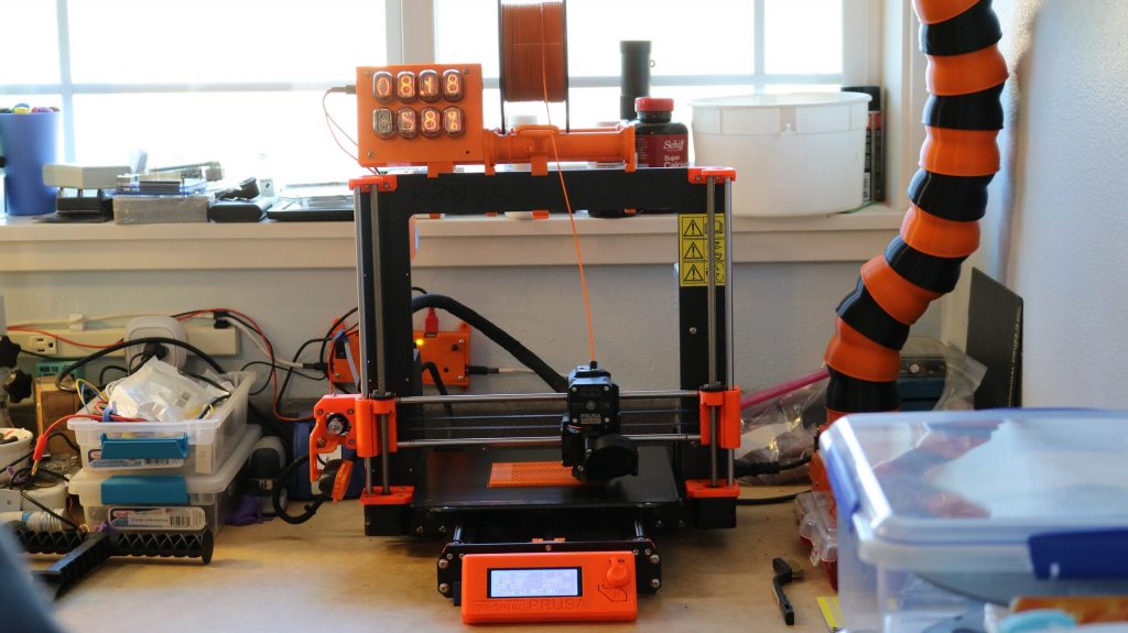 The maker decided to recycle his old temperature/humidity eight-tube display to keep track of his Prusa. The filadometer sits on top of his 3D printer, an Original Prusa i3, and displays how many meters of filament have been used and the completion percentage of the print job on seven IN-12 and one IN-15 Nixie tubes.