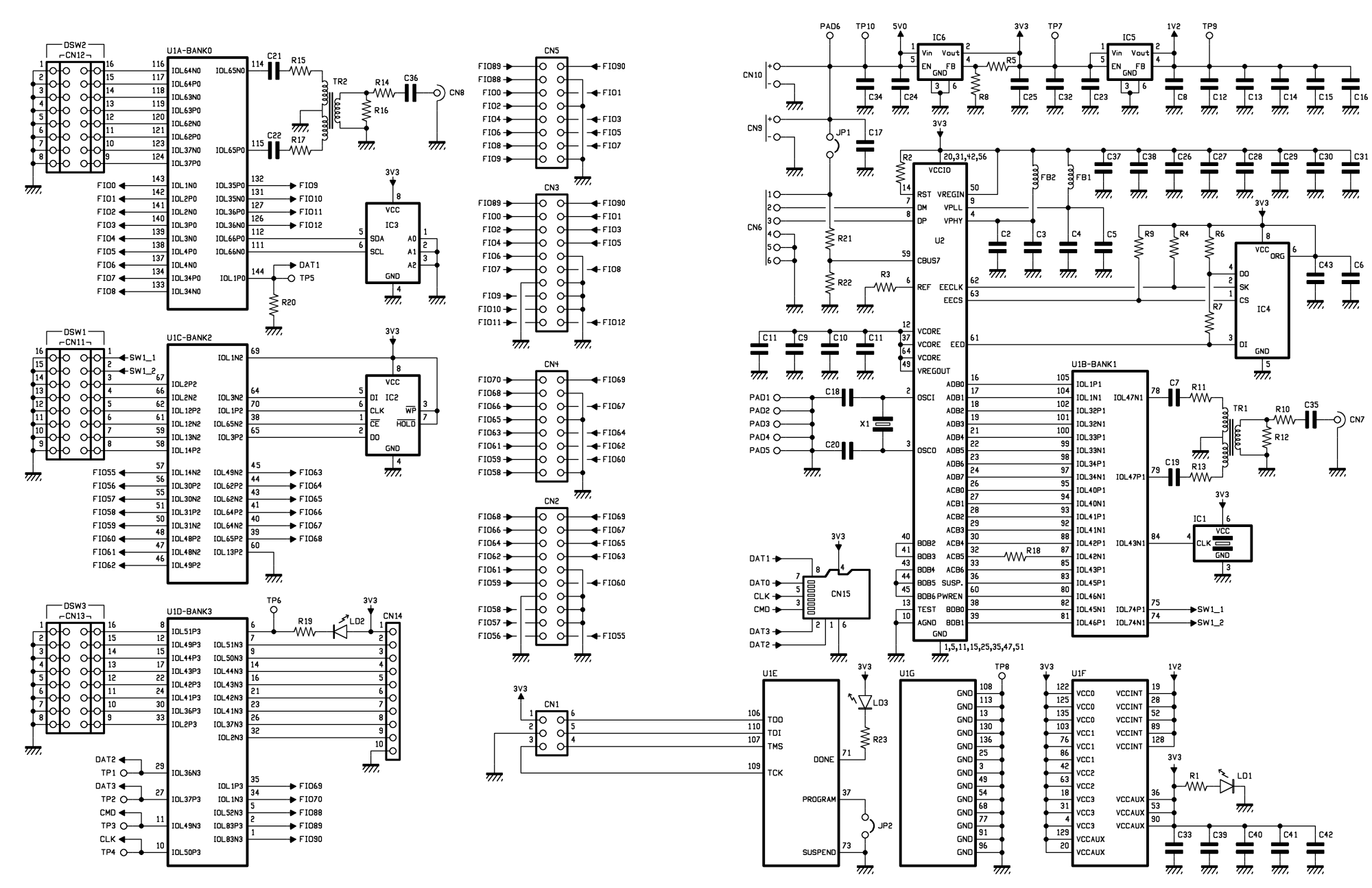 It is now the case to deepen our knowledge of the board, by analysing the circuit diagram and starting from the FPGA (signed as U1) that, given that the unit starts as an evaluation board, has all the I/Os extended towards the pads: some have been thought so to host connectors, other ones for mounting pin-strips or dip-switches; for each group of lines it is possible to mount (on the corresponding bus) one or more connectors, pin-strips, etc. that will prove to be in parallel.