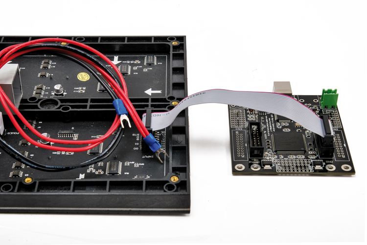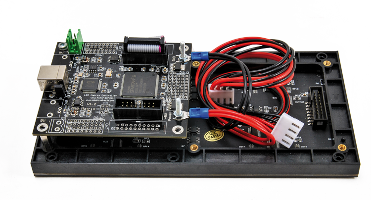 Each panel (independently from how many LEDs form the matrix) has two IDC connectors, one for the data input and the other one for the output, enabling to connect more panels in cascade, so to form even bigger screens. The panel’s power source is a DC voltage one, having a value ranging from 3.3 to 5 V; the absorption is of about 2A for the 16×32 one, and of around 4 A as for the one with 32×32 LEDs.