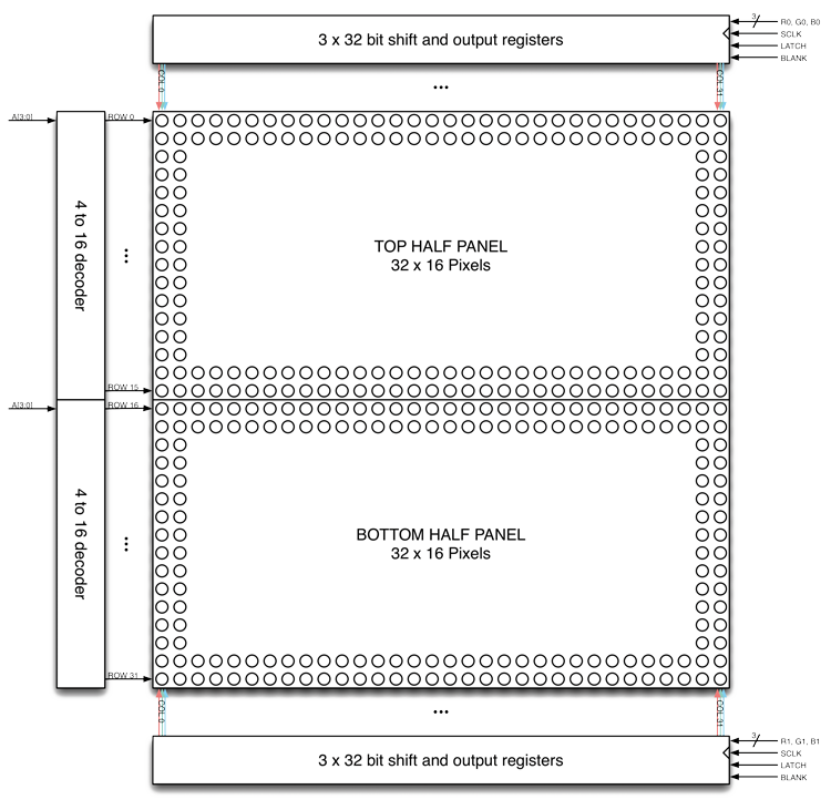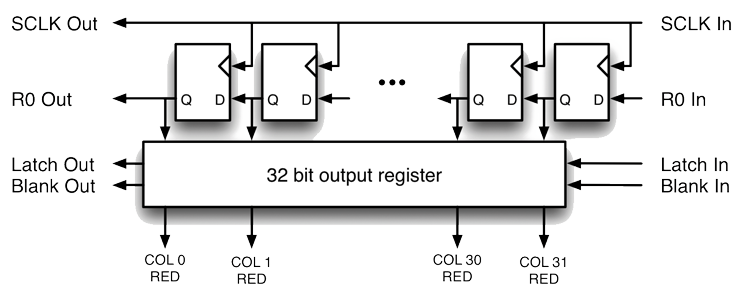 The inputs for each shift-register triad refer to Rx, Gx, Bx: R0, G0 and B0 are the inputs given for the upper part of the 32×32 block, and R1, G1, B1 are the ones for the lower part. The blank, strobe and clock (SCLK) lines are on the other hand common to the registers of the whole display.