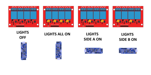 In our application we decided to control the 4 relays in such a way as to guarantee – in the 2 environments where this system will be installed – two brightness levels; this will be achieved by lacing two lighting bodies for the environment and by turning on only one of them or both for each local area. More exactly, we can turn on one of the two lighting bodies (configuration side A), the other (configuration side B) or both, that means leaving the lights off.