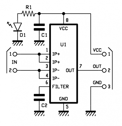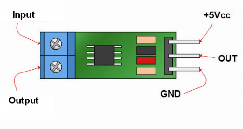 Then we have three terminals, two for the power (positive and negative, i.e. Vcc and GND) and one for the output, referenced to ground; the integrated labeled U1 on the circuit diagram provides an output voltage (measurable between OUT and circuit ground) equal to 185 mV for each detected ampere; since the IC can measure current both ways, so both negative and positive values, the range’s purpose is to respect a reference value which is 2.5 V (the exact half of the power voltage required by the IC) if current is zero. By measuring positive values (IMO current on pins 1 and 2, that is IP+) the output will provide 185 mV more for each ampere and by detecting negative currents (positive clarity on pins 3 and 4, that is IP-) OUT will drop by 185 mV for each ampere.