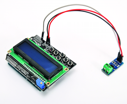 The OUT terminal of the breakout board will be connected to line A1 (analog input A1) of the shield, and it will be brought to the corresponding Arduino Uno rev. through the header (we are not using the A0 because it is already busy, since it is employed by the ATmega328P to read the shield’s keys) while we’re still going to rely on the shield for the power, by connecting Vcc to the 5 V pin of Arduino and the GND 21 of its GND pins.