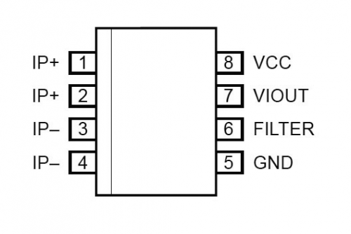 The circuit we propose is based on the ACS712ELCTR-05B-T chip by Allegro Microsystems, which is an integrated current sensor except encapsulated in an 8-pin SOIC container, therefore aimed to SMD, capable of detecting alternate or direct current ranging from 0 to 5 A.