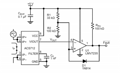 The circuit can also be used without any microcontroller, by connecting its OUT (GND-referenced) to a voltage comparator that is triggered when measured current goes over a set threshold; such an application allows, for instance, by connecting the competitors output to a relay, to disconnect an electric line in case of excessive absorption. The figure shows such circuit, where the comparator is a LMV7235; switching threshold is defined by R1 and R2 and in the figure is 3.76 V, corresponding to 6.8 A (remember that the ACS712 can’t withstand more current than the measurable amount).