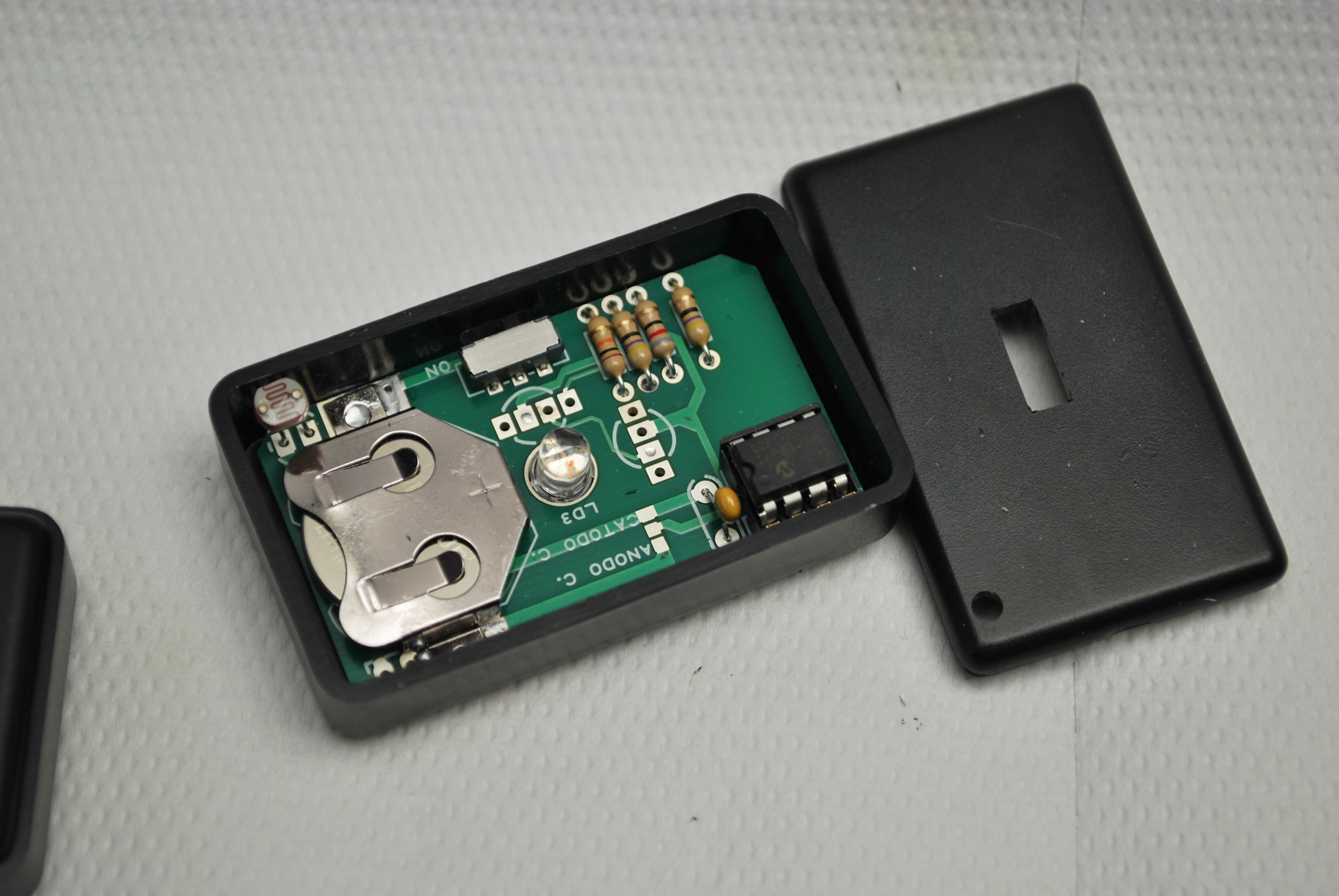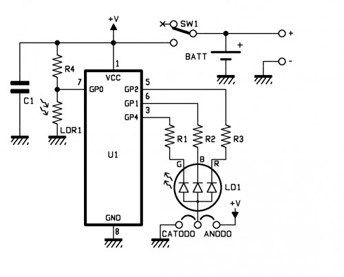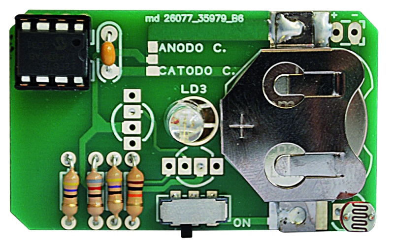 Once powered the circuit after power-on-reset, the PIC initializes its own lines of I/O by assigning GP1, GP2, GP4 as dedicated outputs to control RGB LED LD1; GP0 is instead initialized as input assigned to the A/D converter (AN0) and we connected it to a photoresistor. This solution allows us to turn on the circuit only if the ambient light is weak enough (or if it’s dark …) to allow to see the figure carved into the plastic, but if the environment is too bright, the circuit turns off, so I do not consume the battery.