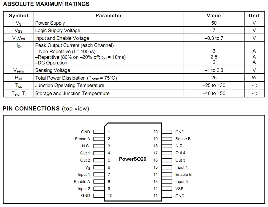 The core of the project is a L298 H-Bridge, a motor driver with this caracteristics: