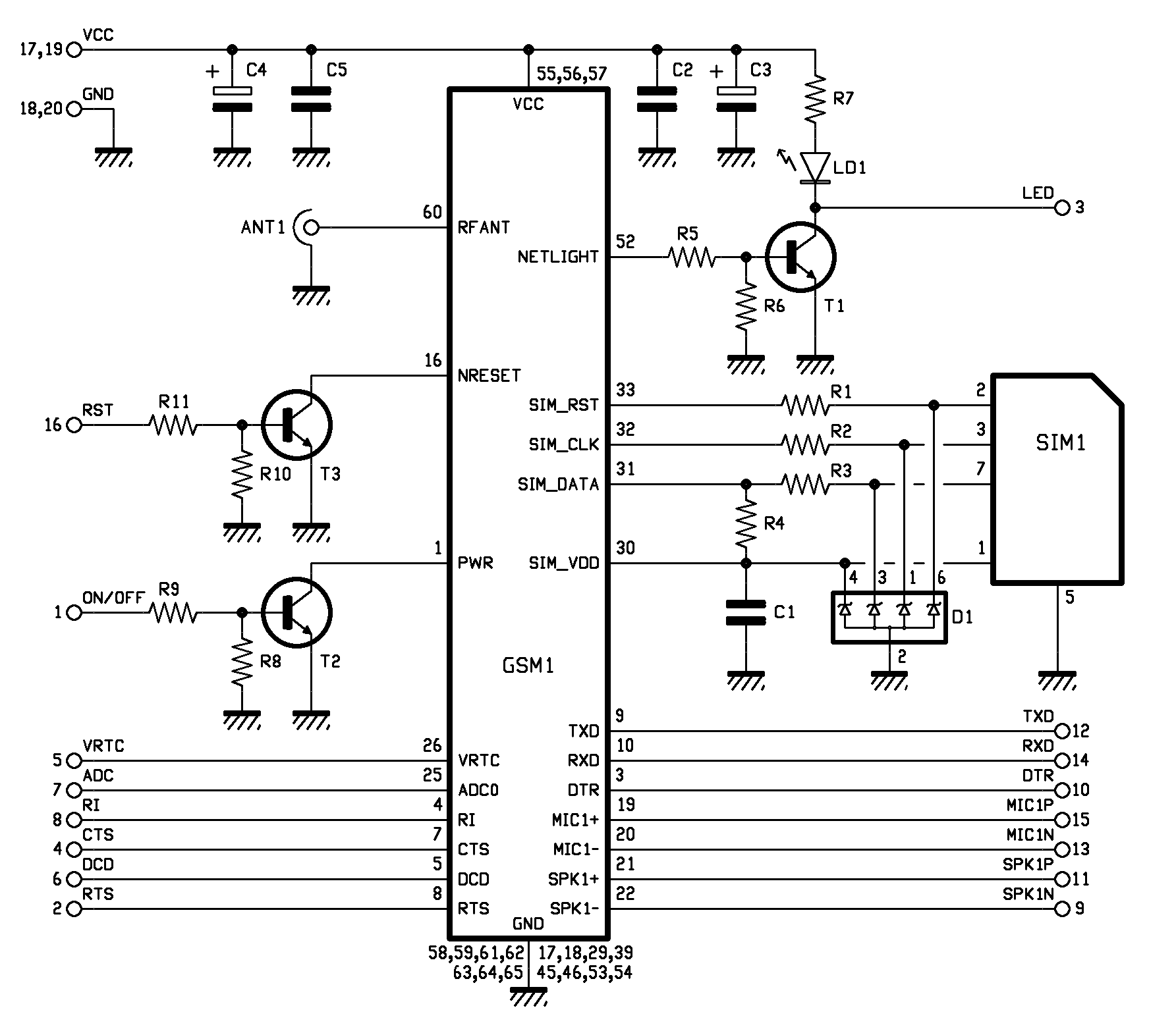 Let’s now talk about transistor T1, used here to locally control the cell phone’s reception LED: its base is polarized from the current logical level on pin 52 (NETLIGHT) for GSM1. The transistor’s collector is where the line to contact 3 of the pin-strip starts; this line is connected with the LED line, which the microcontroller uses to get information regarding the presence of GSM network as well as regarding the connection status of the module (e.g., whether the network is available or not).