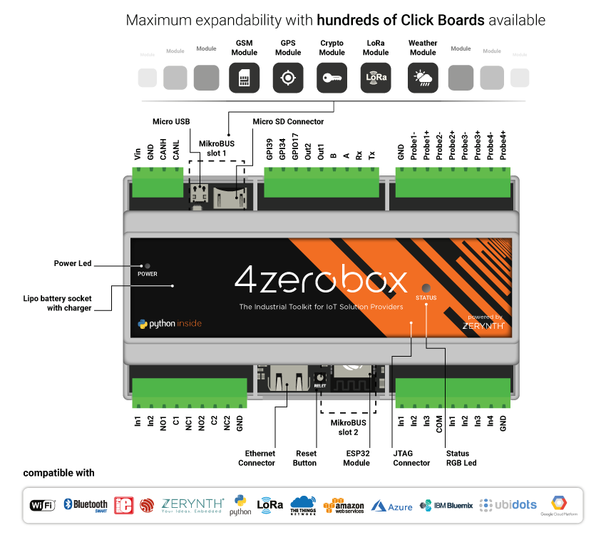 Even though this is just a prototype, we wanted to remind you that the 4zerobox, the industrial toolkit for IoT solution providers, is based exactly on the ESP32 device and Zerynth allows reusing the code you’ve already written for your prototype. Cool, huh? Say thanks to our Zerynth Virtual Machine and its hardware abstraction layer features.